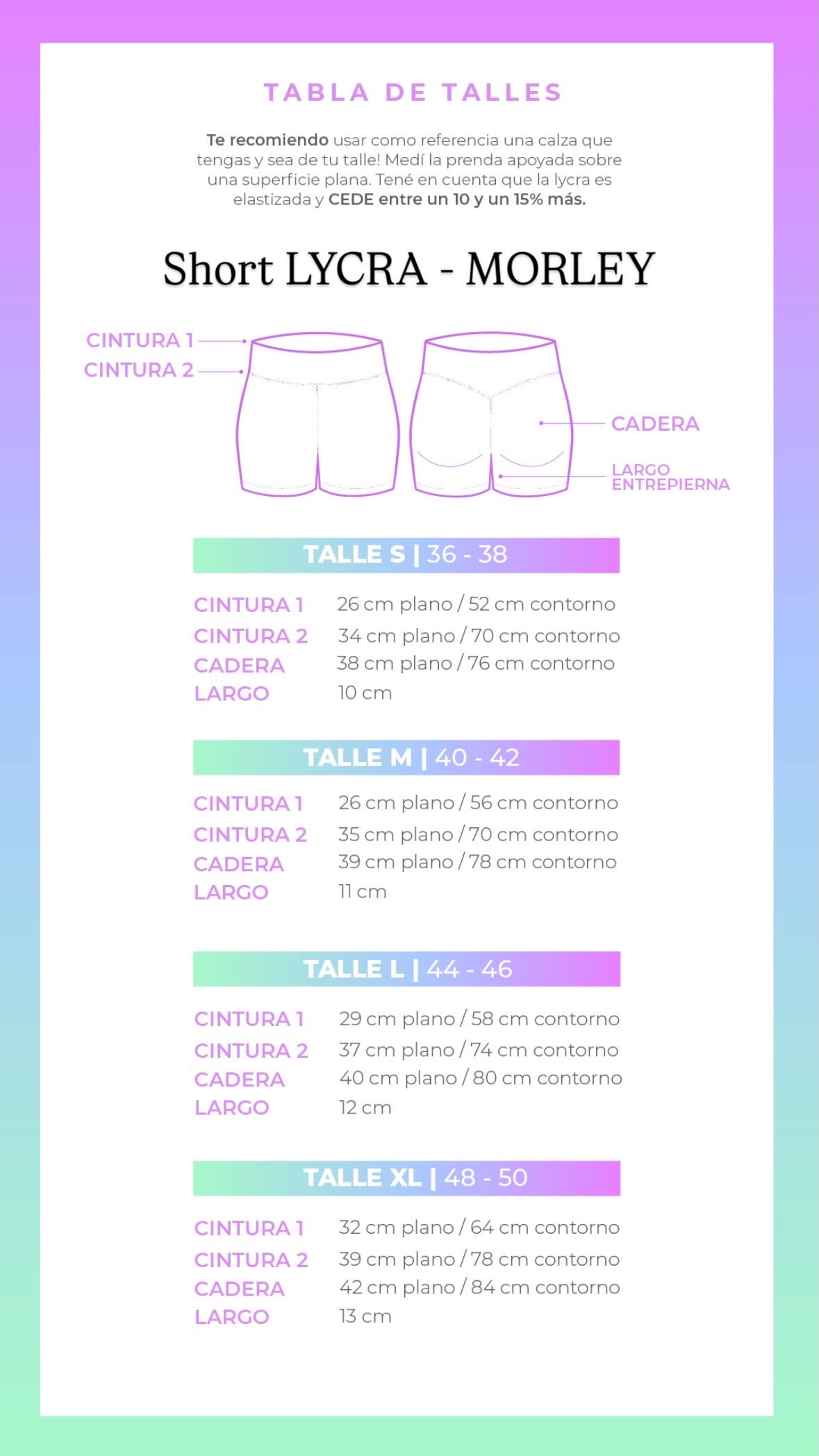 Medidas en cm de la prenda SIN ESTIRAR. Elasticidad +20%