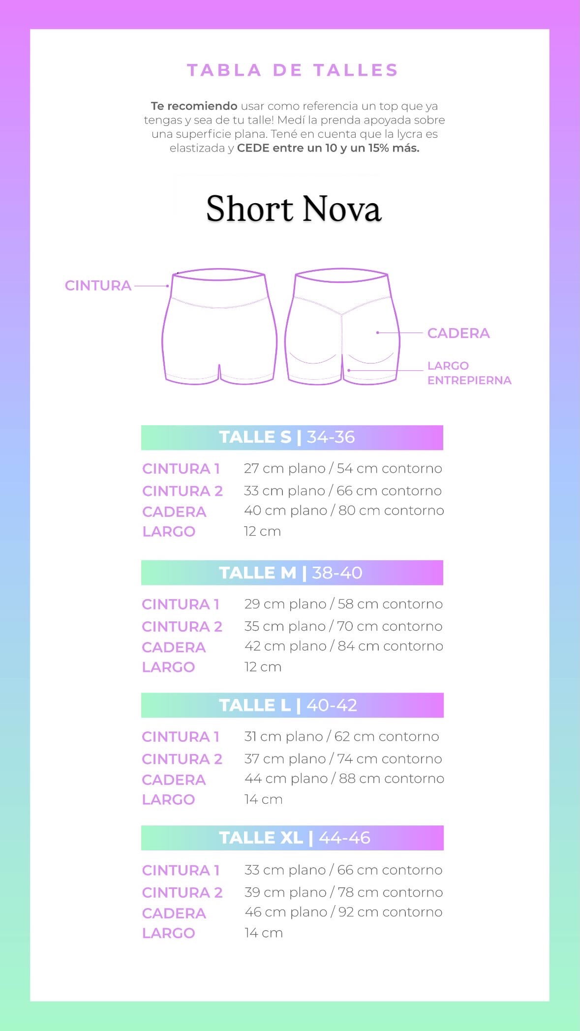 - Cadera: 38 cm plano / 76 cm contorno